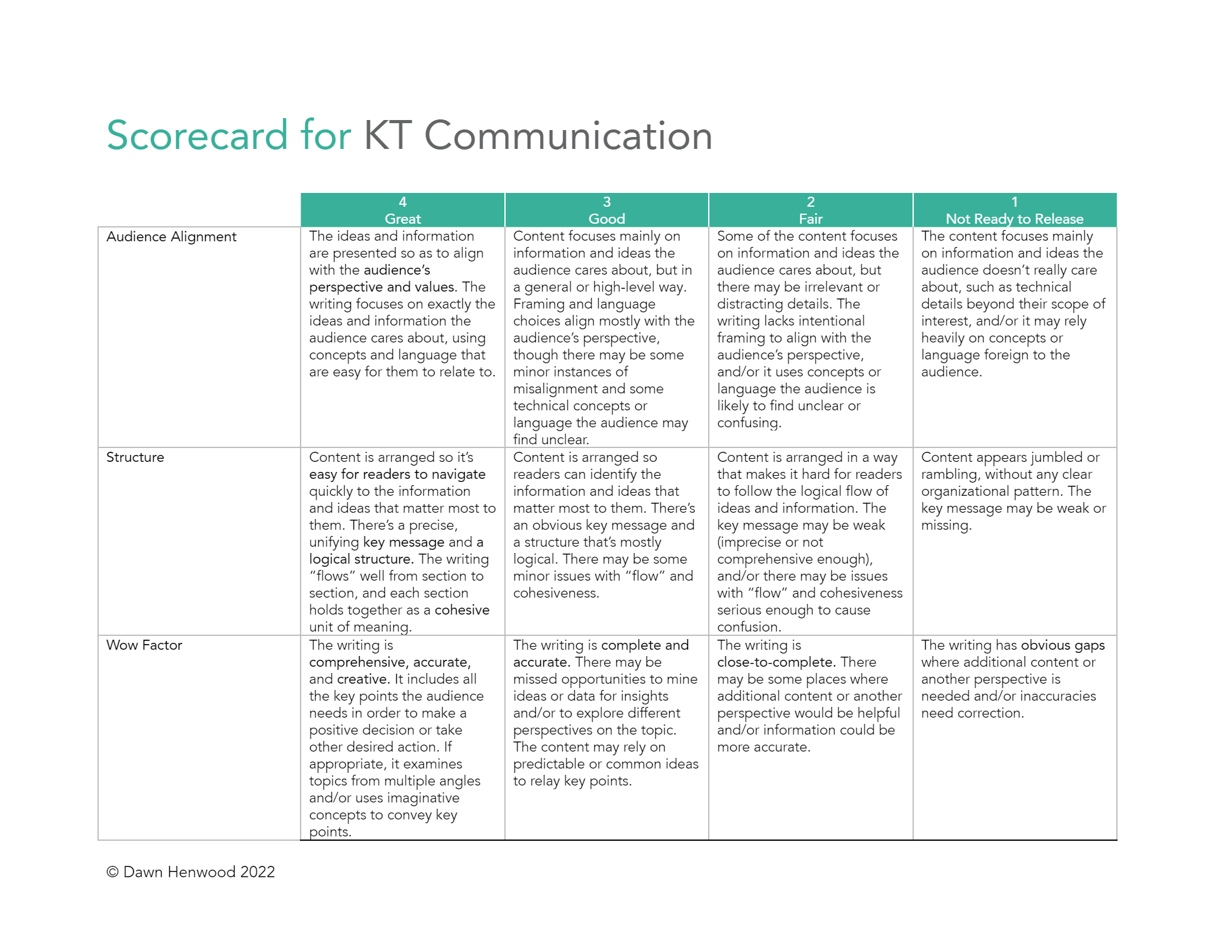 As you prepare your communication product, keep an eye on the assessment criteria in the KT Communication Scorecard. I'll use this tool as part of the written feedback you'll receive following your presentation. (You can download a copy below.)