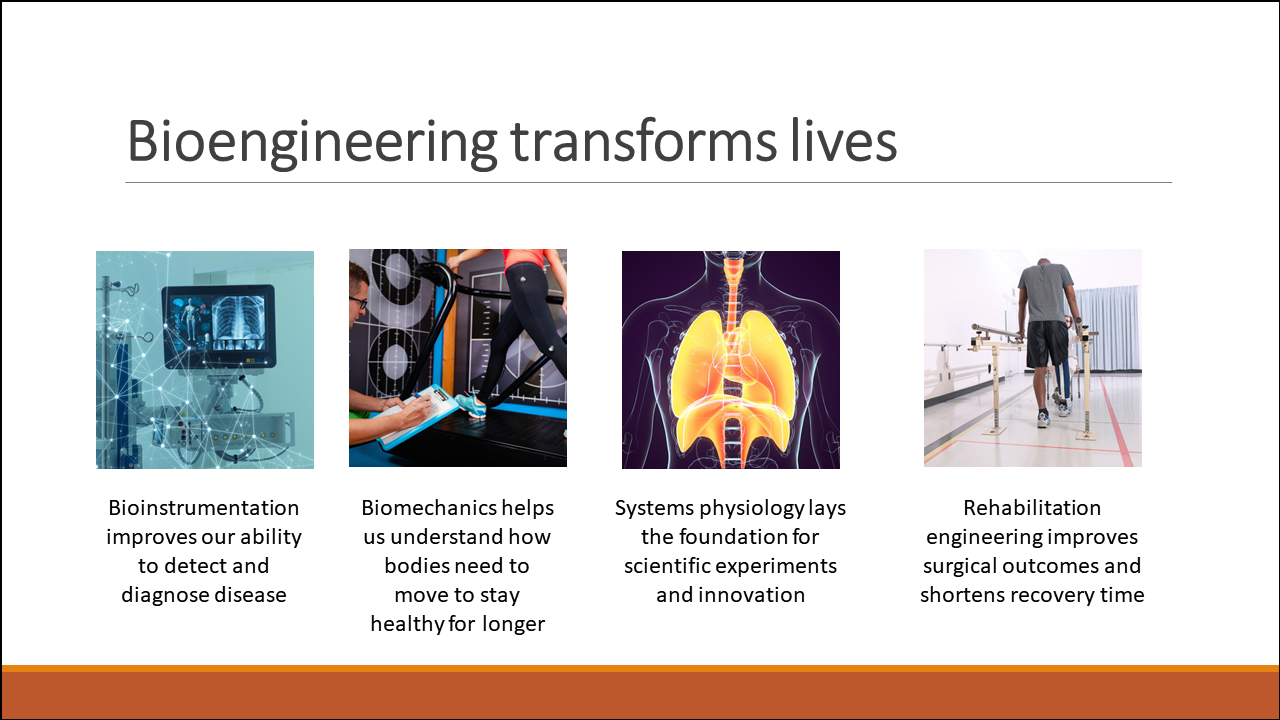 Many teaching presentations focus on delivering information. For example, if you're teaching university students about the four areas of specialization within bioengineering, then you might create a slide that looks like this: